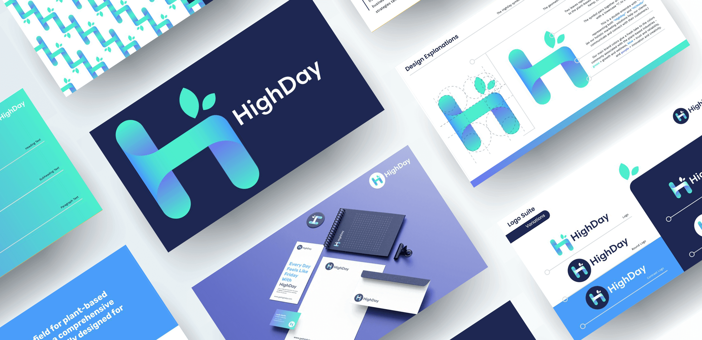 Logo variations: The logo suite was designed to represent both the energy and expertise that HighDay fosters among its clients. The final design is sleek, offering a subtle, professional nod to the plant-based industries they serve. It’s flexible across digital touchpoints, marketing collateral, and investor-facing materials